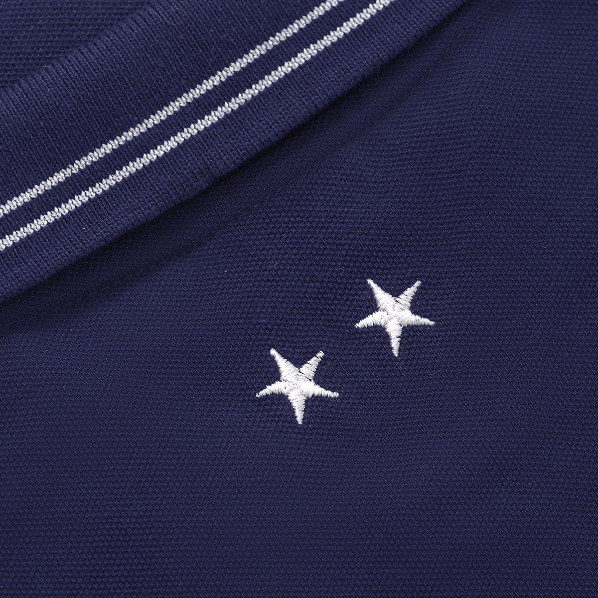 Chomba Salida 2025 Le Coq Sportif Color Azul Marino de piqué de algodón con Escudo Dos Estrellas Bordado Color Plateado y detalle de doble linea en cuello y mangas .-