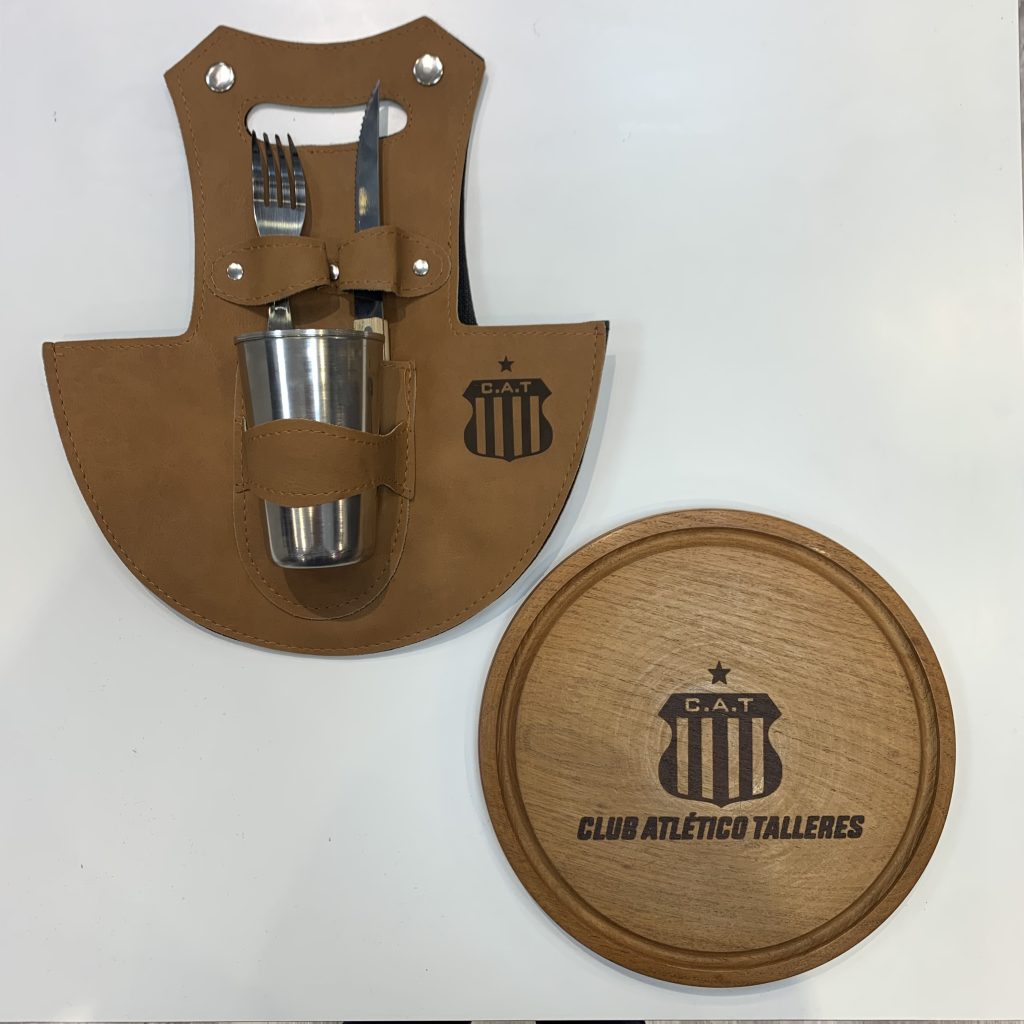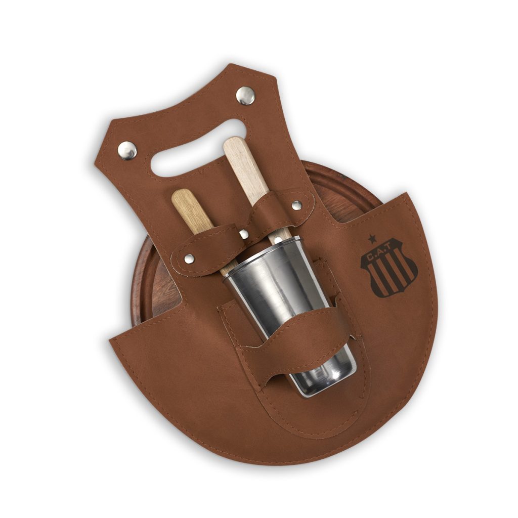 Set de asado incluye estuche de eco cuero, tabla gravada de madera, vaso de acero inoxidable y cubiertos de acero inoxidable con mango de madera.